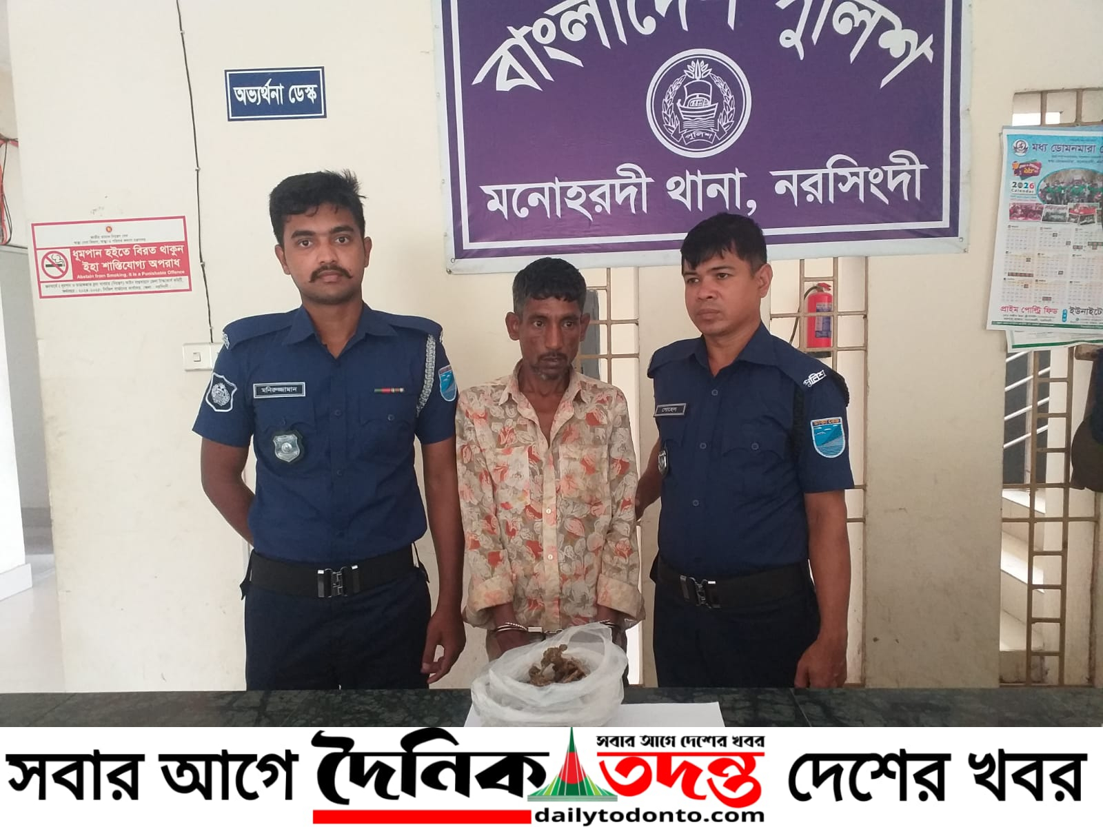 এসময় ঘটনাস্থল থেকে রবি মিয়া (৫০), পিতা মৃত আজিজ, গ্রাম চরমান্দালিয়া ডঙ্গীবাড়ি, ৪ নম্বর ওয়ার্ড, ইউনিয়ন চরমান্দালিয়া, থানা মনোহরদী—কে হাতেনাতে আটক করা হয়। পরবর্তীতে তার দেহ তল্লাশি করে ১০০ গ্রাম গাঁজা এবং ১০ পিস ইয়াবা ট্যাবলেট উদ্ধার করা হয়। জব্দকৃত আলামতসহ তাকে থানায় নিয়ে আসা হয়।
