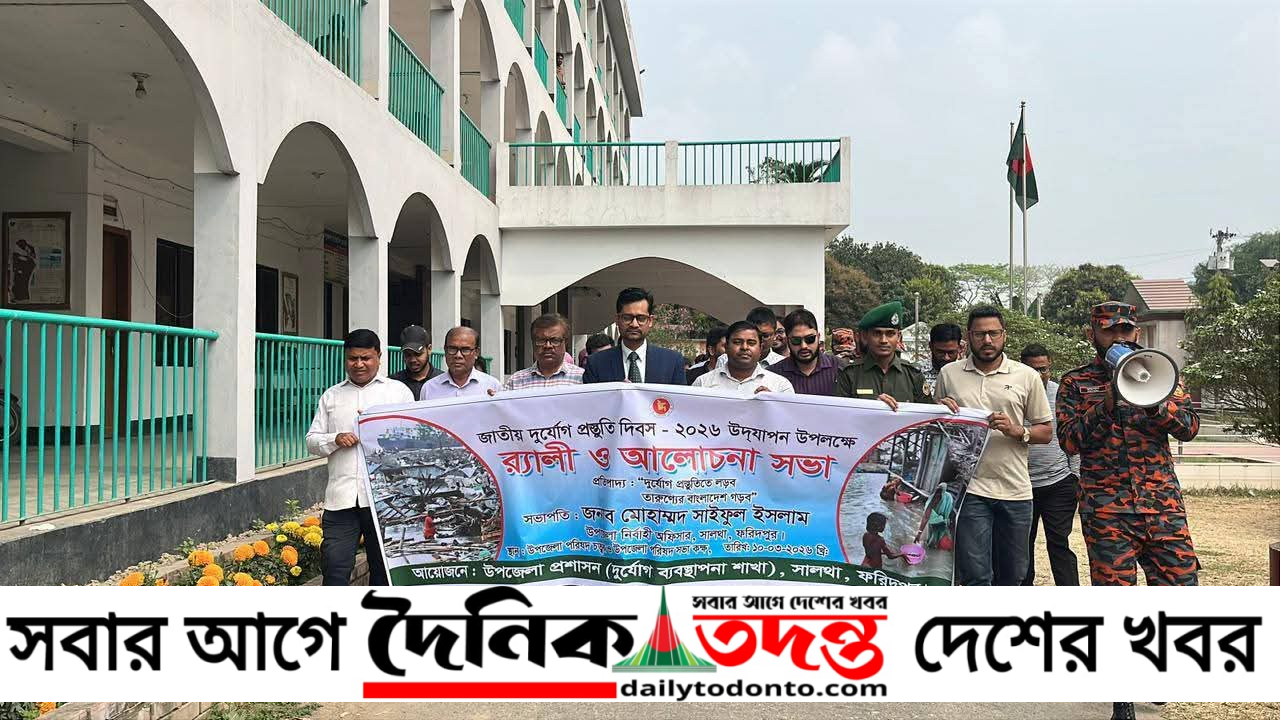 " দুর্যোগ ব্যবস্থাপনা লড়বো, তারুণ্যের বাংলাদেশ গড়বো, এই স্লোগানকে সামনে রেখে ফরিদপুরের সালথায় নান কর্মসূচির মধ্য দিয়ে আন্তর্জাতিক দুর্যোগ প্রশমন দিবস পালিত হয়েছে। উপজেলা প্রশাসনের আয়োজনে আজ মঙ্গলবার (১০ মার্চ) সকালে উপজেলা চত্বর থেকে একটি বর্ণাঢ্য র্যালি বের করা হয়। র্যালিটি উপজেলা পরিষদ থেকে শুরু করে গুরুত্বপূর্ণ সড়ক প্রদক্ষিন শেষে পুনরায় পরিষদ চত্বরে এসে শেষ হয়। র্যালিতে বিভিন্ন সরকারি বেসরকারি দপ্তরের কর্মকর্তা কর্মচারী, স্থানীয় স্কুল-কলেজের শিক্ষক শিক্ষার্থীরা অংশগ্রহণ করেন। র্যালি শেষে উপজেলা পরিষদ সম্মেলন কক্ষে এক আলোচনা সভার আয়োজন করা হয়। উক্ত আলোচনা সভায় উপজেলা নির্বাহী অফিসার মোঃ সাইফুল ইসলামের সভাপতিত্বে এ সময় উপস্থিত ছিলেন, উপজেলা কৃষি অফিসার সুদর্শন শিকদার, উপজেলা প্রকল্প বাস্তবায়ন কর্মকর্তা হুমায়ুন কবির, নির্বাচন অফিসার ইমরানুর রহমান, উপজেলা একাডেমিক সুপারভাইজার শওকত আকবর, হালদা ফায়ার সার্ভিসের সদস্যগণসহ বিভিন্ন দপ্তরের কর্মকর্তা ও সাংবাদিকবৃন্দ উপস্থিত ছিলেন। বক্তারা বলেন, একটি দুর্যোগ প্রবণ দেশ। প্রতি বছরেই ঘূর্ণিঝড়, বন্যা, জলোচ্ছ্বাস, ভূমিকম্প সহ নানা প্রাকৃতিক দুর্যোগের মুখোমুখি হতে হয় আমাদের। এসব দুর্যোগের ক্ষয়ক্ষতি কমাতে হলে আগে থেকে প্রস্তুত থাকতে হবে। দুর্যোগ মোকাবেলায় কেবল সরকারি উদ্যোগ নেয়, স্থানীয় পর্যায়ে জনগণের সক্রিয় অংশগ্রহণ ও জরুরী। শিক্ষা প্রতিষ্ঠান থেকে শুরু করে পরিবার পর্যায় সচেতনা গড়ে তুলতে হবে।